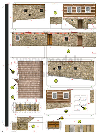 Ukázky vystřihovacích stran papírového modelu Krkonošská chalupa